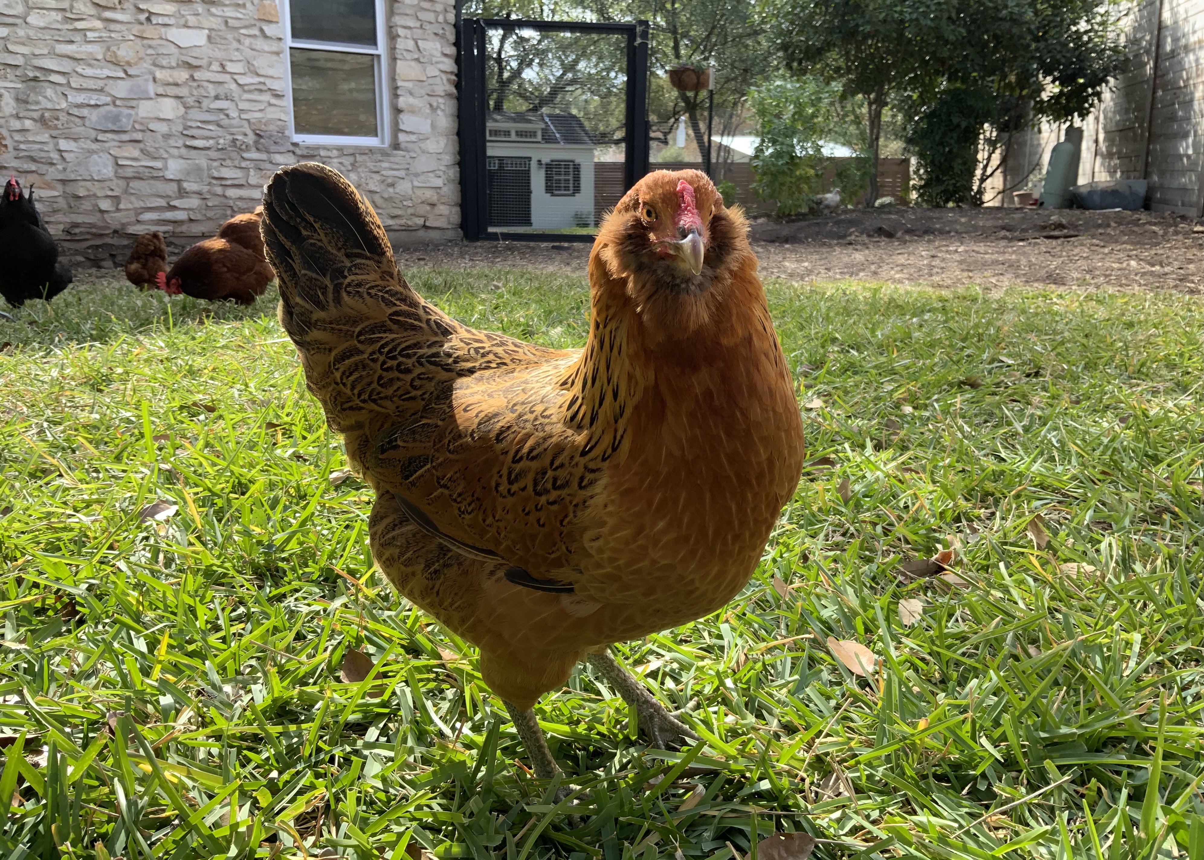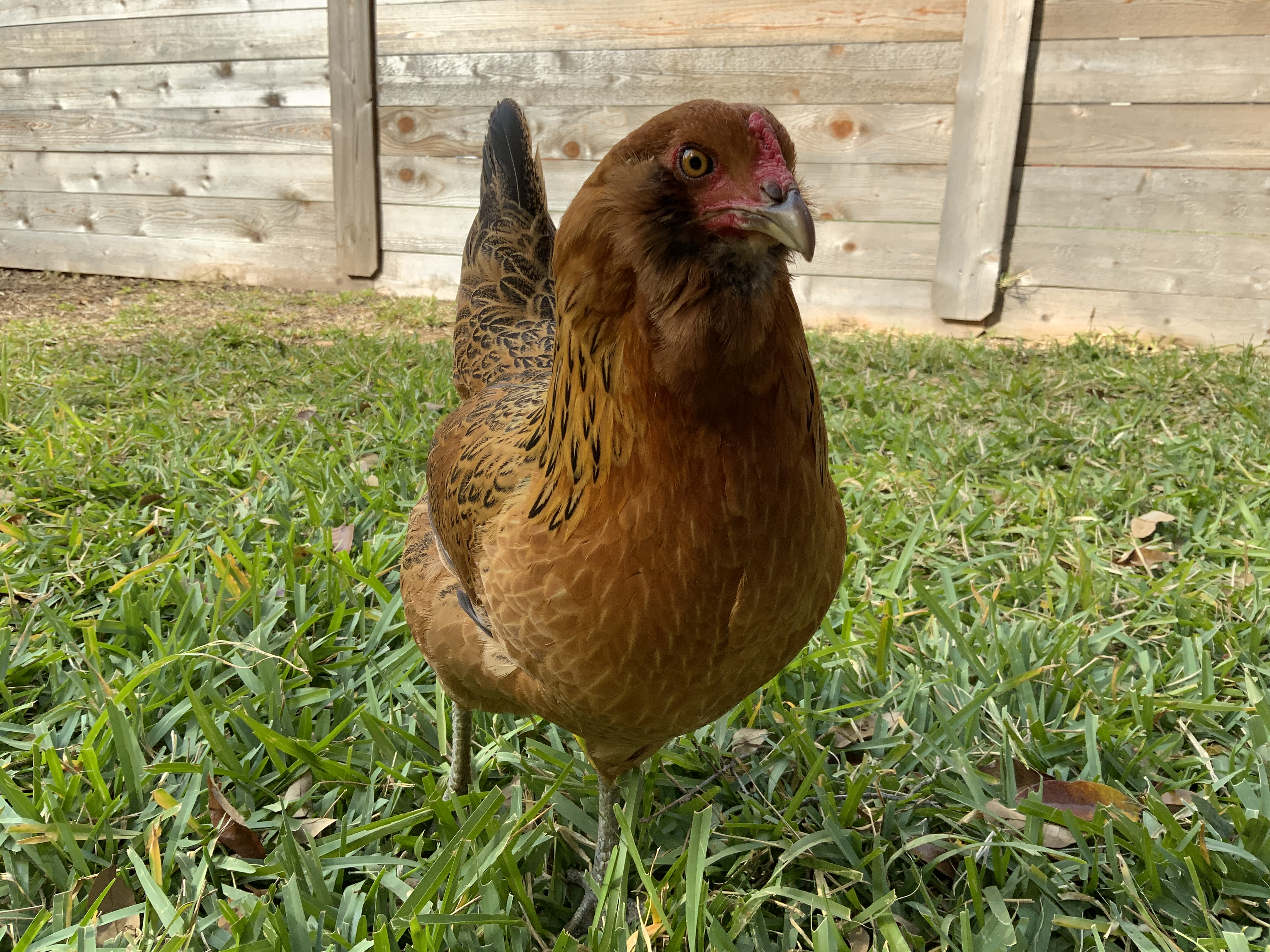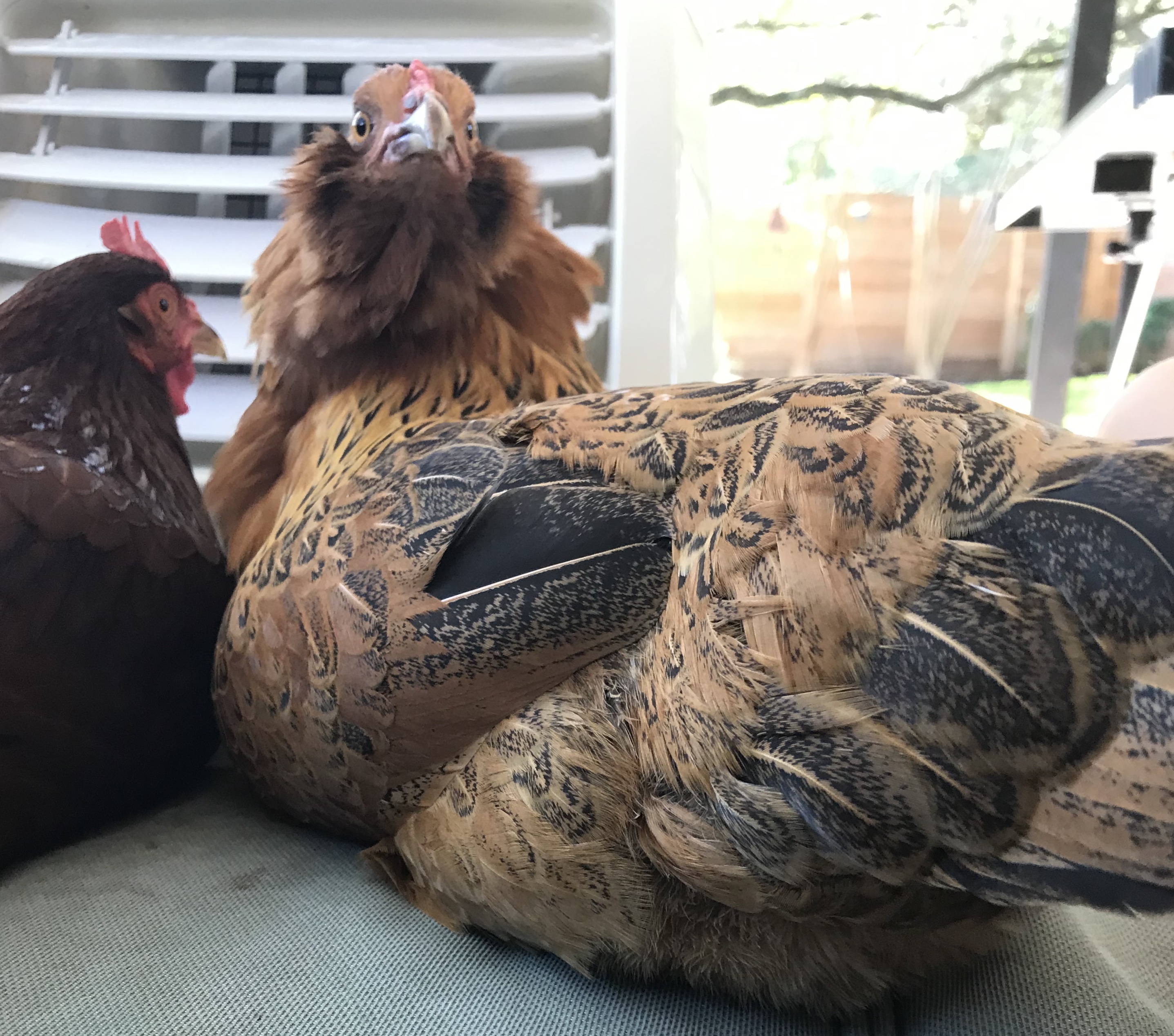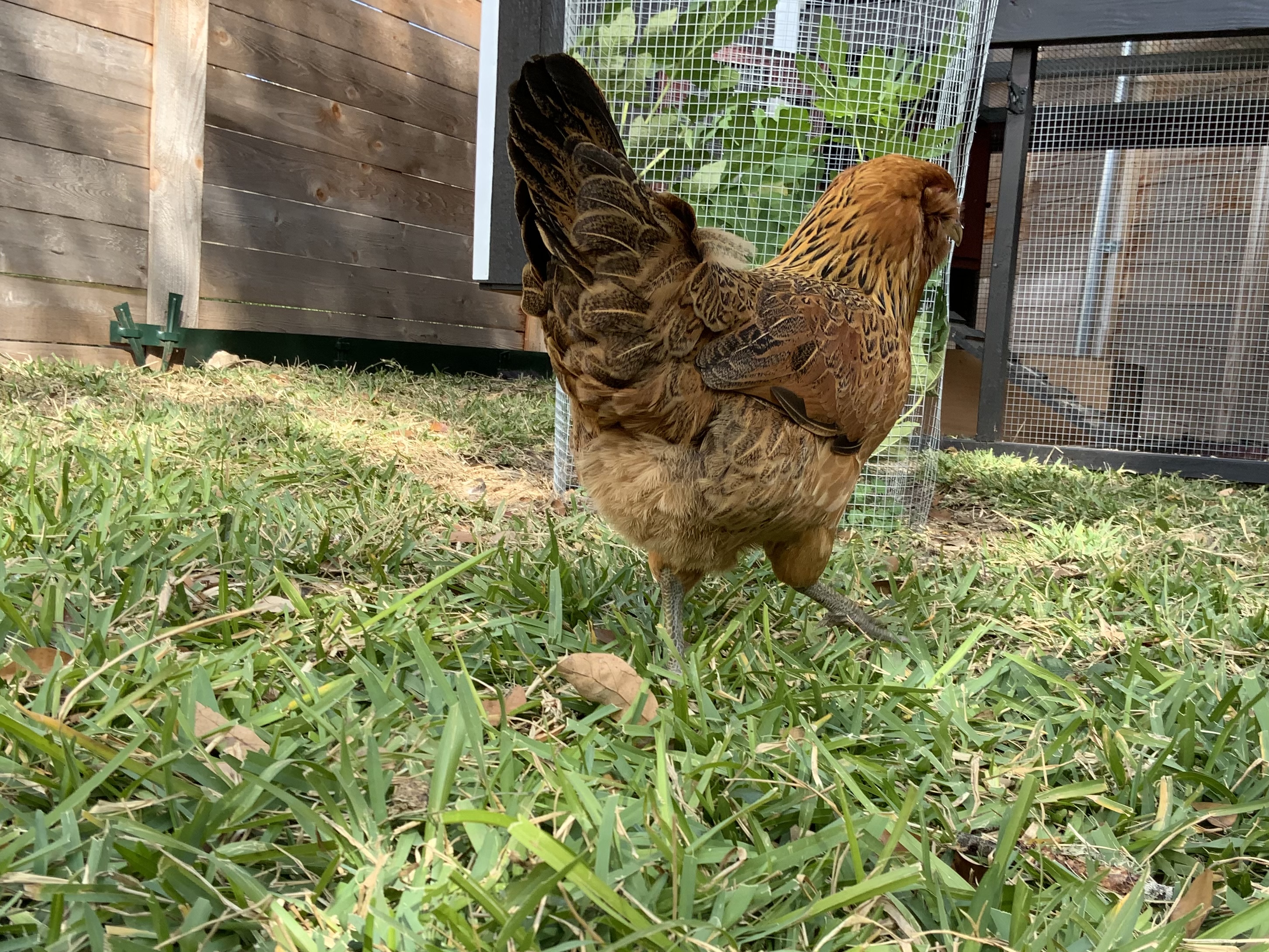 Kiwi was a crazy chick, always getting into trouble and wanting to be outside, she was light brown with a strip down her back, like a kiwi. Now her coloring is completely different. She has a pea comb, muffs, and a beard. We were worried that she was a rooster because of her tail feathers, aggressive nature, and loner attitude. She is an amazing flyer, once because she was being chased by a dog, flew onto our 8ft fence.