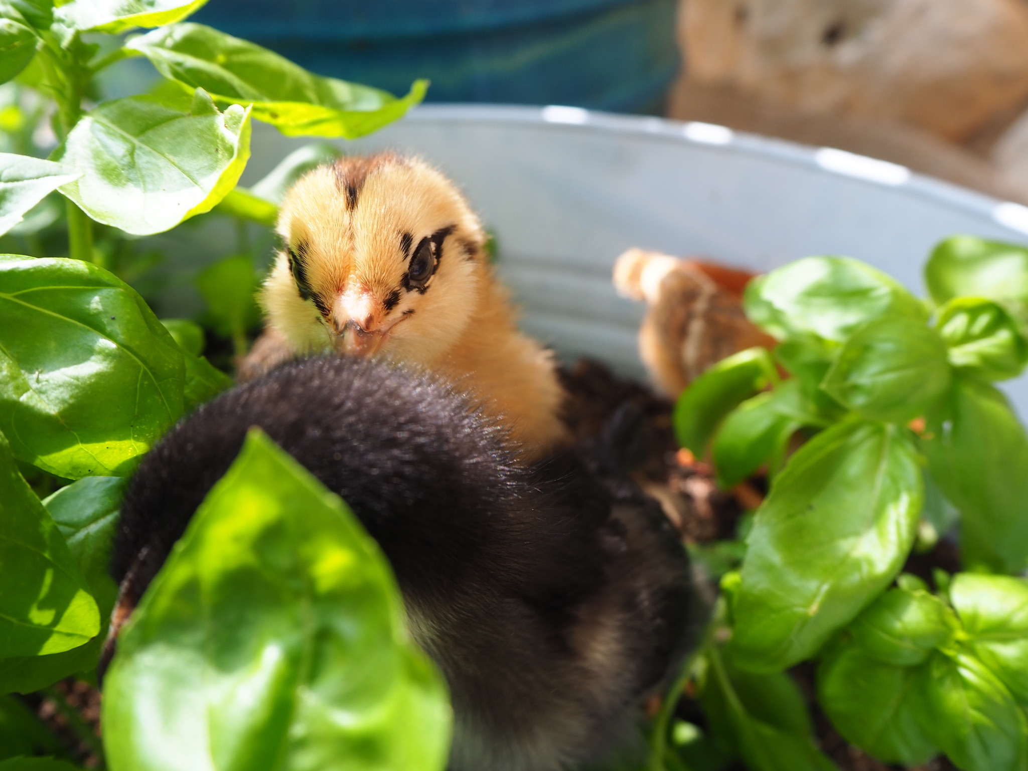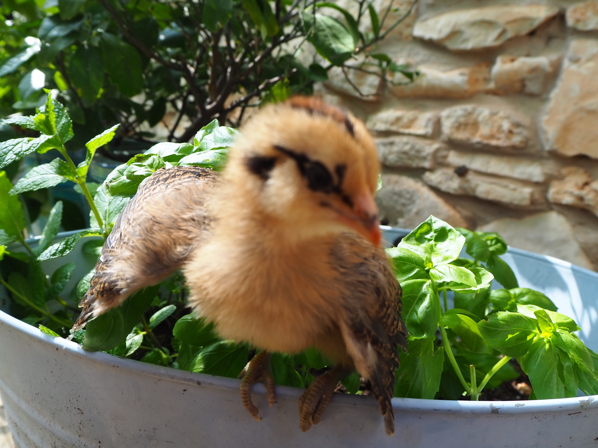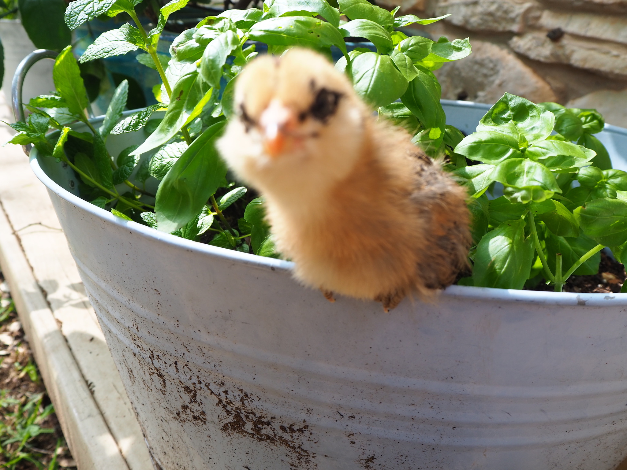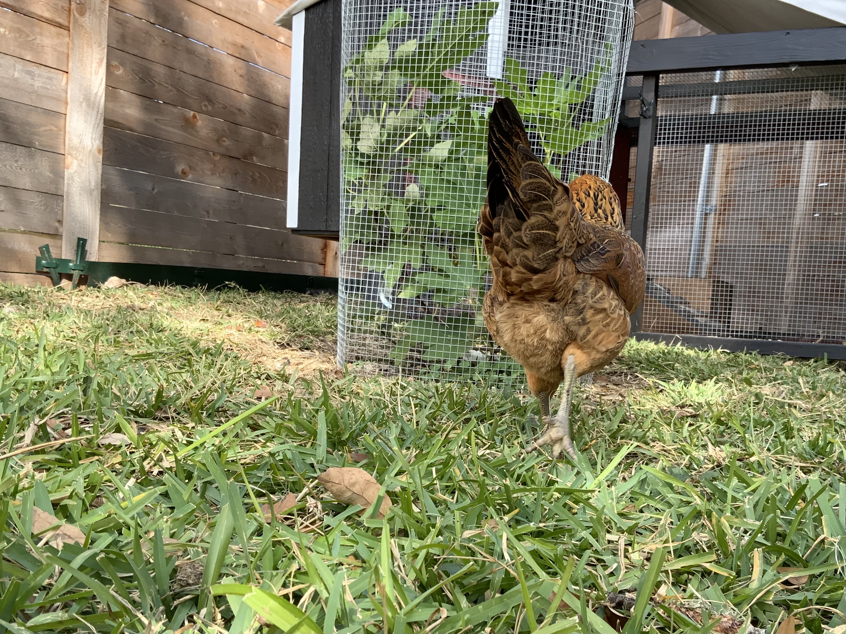 Kiwi was a crazy chick, always getting into trouble and wanting to be outside, she was light brown with a strip down her back, like a kiwi. Now her coloring is completely different. She has a pea comb, muffs, and a beard. We were worried that she was a rooster because of her tail feathers, aggressive nature, and loner attitude. She is an amazing flyer, once because she was being chased by a dog, flew onto our 8ft fence.