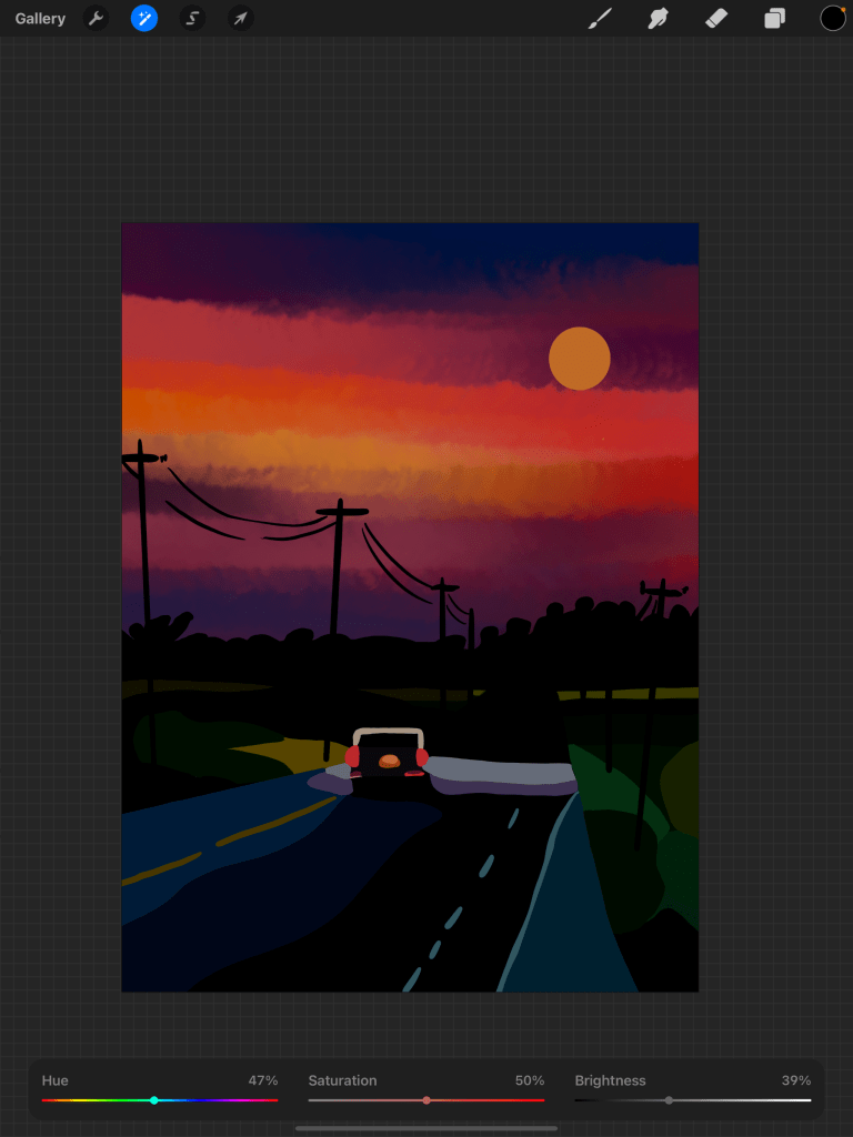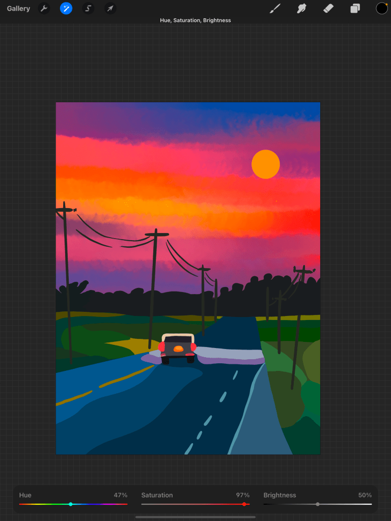 Hue is responsible for completely changing the colors. In the examples, I mostly focus on the sky, effects that are specific for this image because it’s like the car is driving at night.