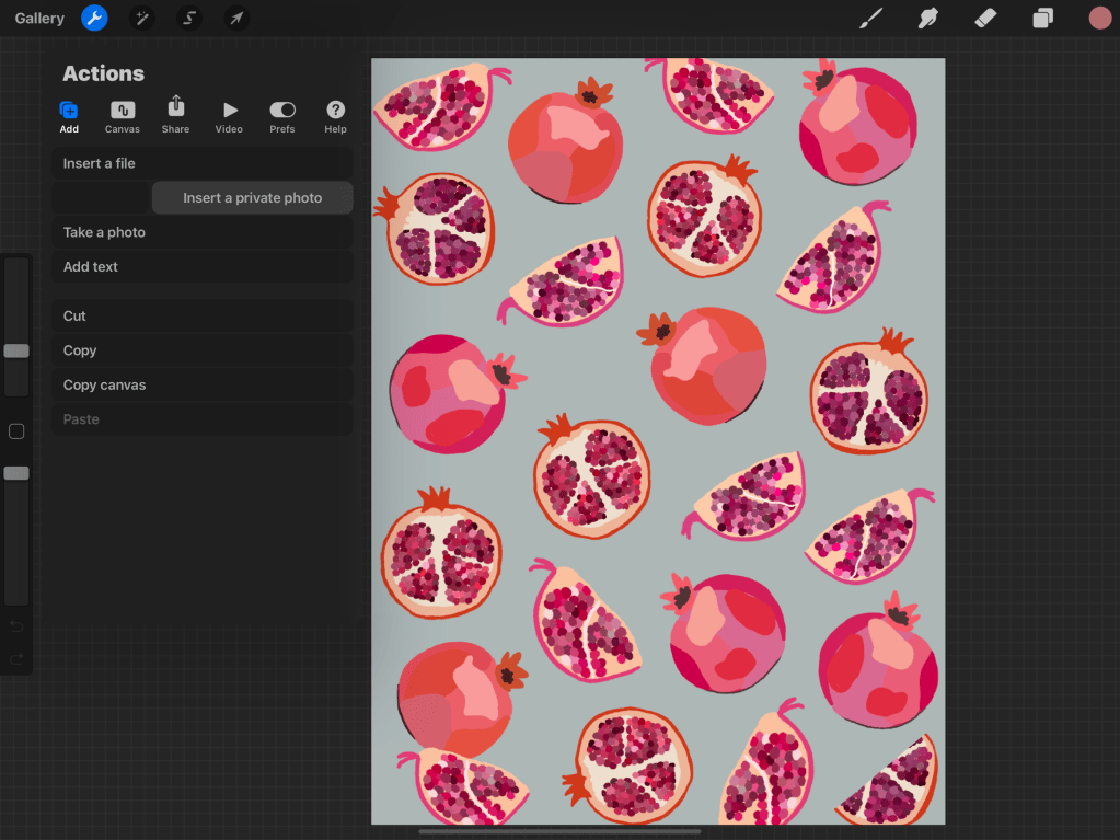 Time-lapse is something you can show others when your artwork is done but what if you took notes or traced and you want a private layer that doesn’t show up? Private layers are something new that you can take advantage of. Private files and photos are two options. But what I want to see them create is just a private layer without anything else inside of it. To make a private layer go to insert a photo and swipe left.
