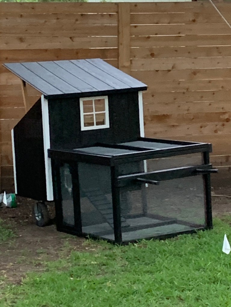 We have moved our chickens around a lot. But finally we settled on the corner of our yard and we blocked off the area. Why not let them go into your entire yard? Chickens want to go where they want to go, but after putting Kiwi back countless times she learned to stay there. If you let them go everywhere, things get destroyed, plants and gardens get eaten, patios got pooped on, and dirt went everywhere. So we decided this was best, and because the space is so large we felt comfortable with them being there.